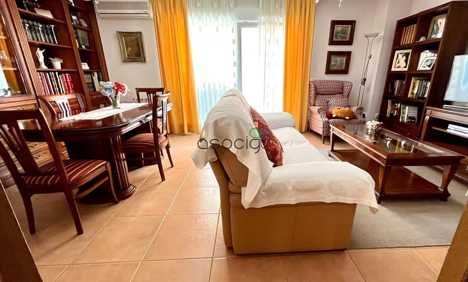 Desde el vial comunitario, entramos a la planta principal. El acceso cuenta con un bonito porche cerrado. Una vez dentro, encontramos el recibidor con armario empotrado, que da paso al aseo, a la amplia cocina amueblada y al salón comedor que se comunica con el jardín, solado íntegramente.